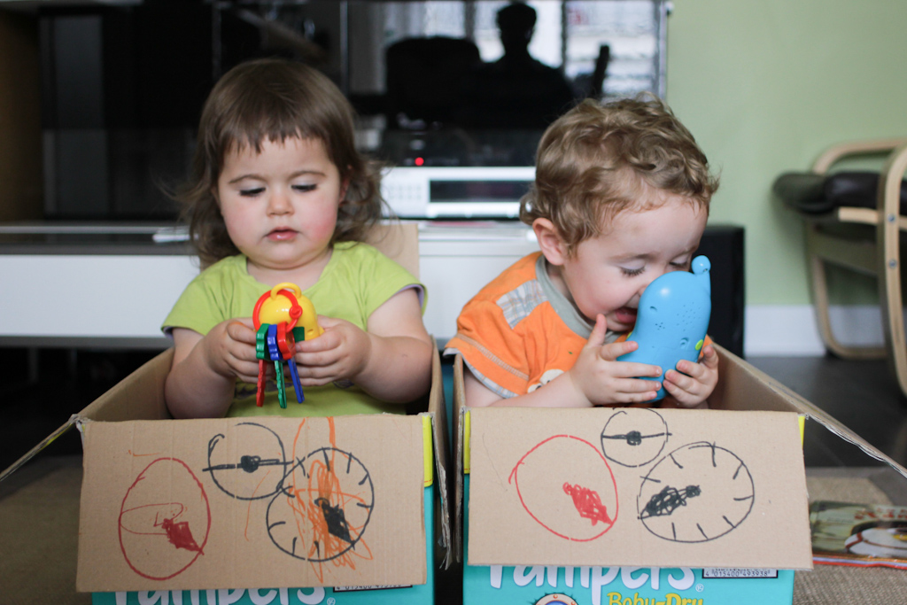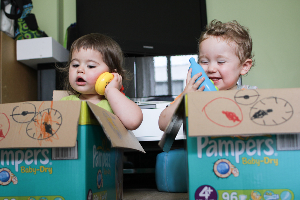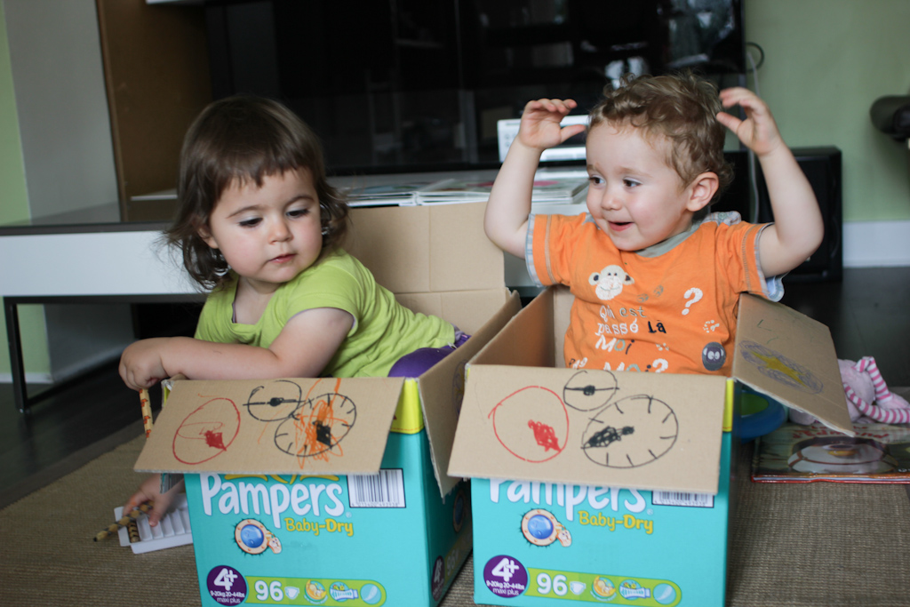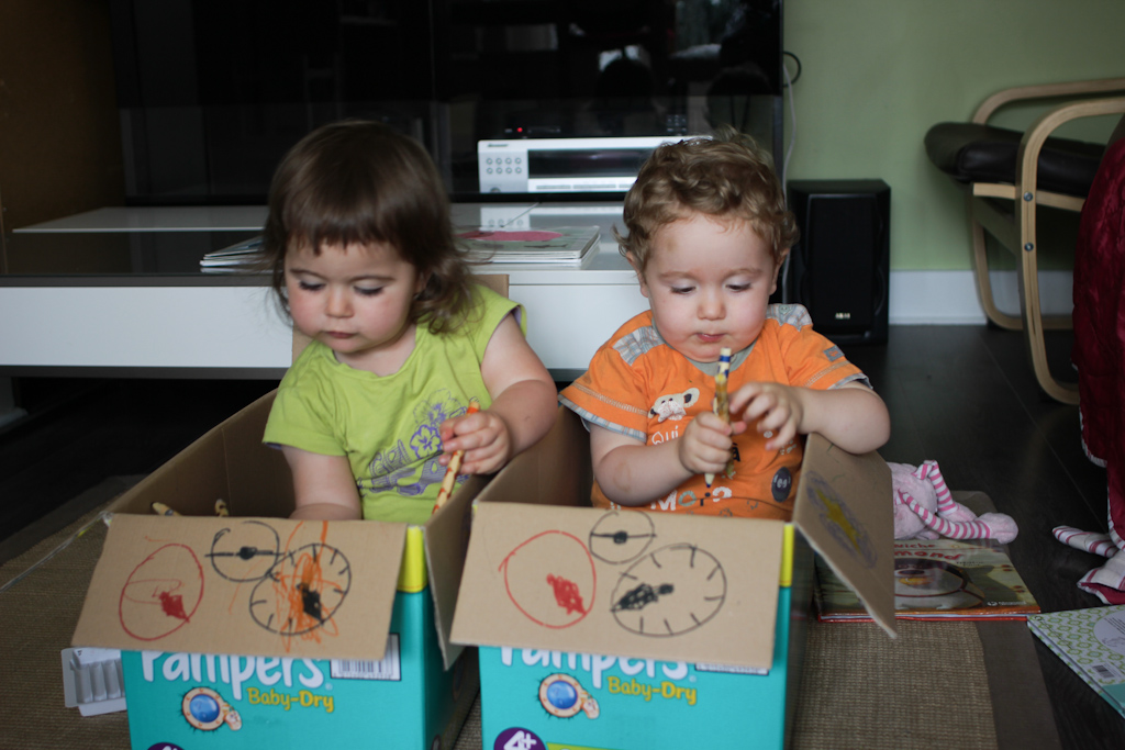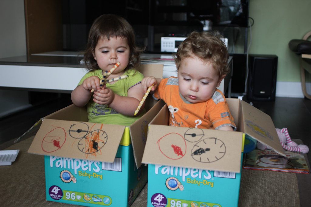 2 Cartons de Pampers, des feutres et décollage immédiat!