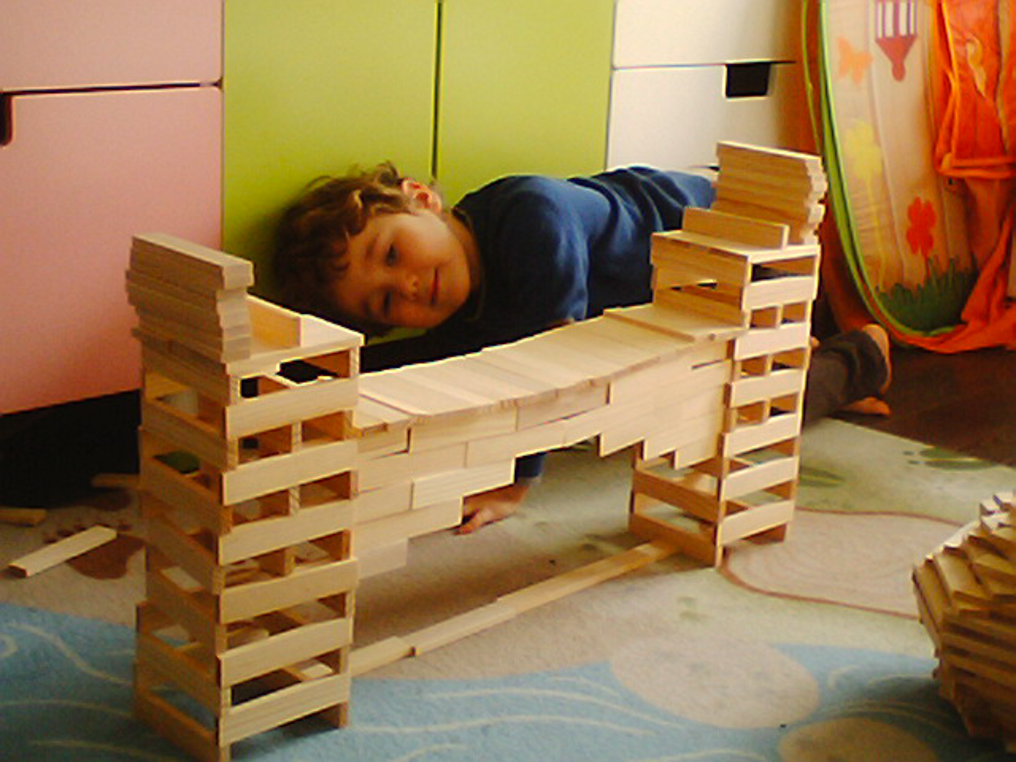 Alors je lui ai sorti la “notice” kapla et il a commencé avec une première construction qui lui plaisait bien, pendant que moi, j’essayais de comprendre comment faire un pont avec juste la photo du résultat final…